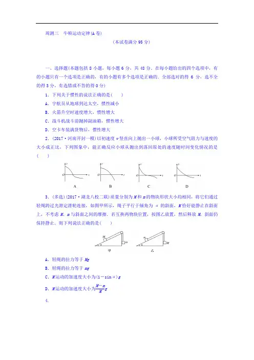 课练8 牛顿运动定律1.下列说法中正确的是( )A.运动越快的汽车越不容易停下来,是因为汽车运动得越快,惯性越大B.作用力与反作用力一定是同种性质的力C.伽利略的理想实验是凭空想象出来的,是脱离实际的理论假设D.马拉着车向前加速时,马对车的拉力大于车对马的拉力2.对于一些实际生活中的现象,某同学试图从惯性角度加以解释,其中正确的是( )A.采用了大功率的发动机后,某些一级方程式赛车的速度甚至能超过某些老式螺旋桨飞机的速度,这表明:可以通过科学进步使小质量的物体获得大惯性B.“强弩之末势不能穿鲁缟”,这表明强弩的惯性减小了C.货运列车运行到不同的车站时,经常要摘下或加挂一些车厢,这会改变它的惯性D.摩托车转弯时,车手一方面要适当地控制速度,另一方面要将身体稍微向里倾斜,这是为了通过调控人和车的惯性达到安全行驶的目的3.一物体受绳的拉力作用由静止开始前进,先做加速运动,然后改做匀速运动,再改做减速运动,则下列说法中正确的是( )A.加速前进时,绳拉物体的力大于物体拉绳的力B.减速前进时,绳拉物体的力大于物体拉绳的力C.只有匀速前进时,绳拉物体的力与物体拉绳的力大小才相等D.不管物体如何前进,绳拉物体的力与物体拉绳的力大小总相等4.下列关于物理量、物理量单位和物理意义的说法正确的是( )A.加速度是描述速度变化的物理量B.在力学范围内,国际单位制中的基本单位是:米、秒、焦耳C.使质量为1千克的物体产生1米/秒2的加速度的力就是1牛顿D.物理量是标量的,一定没有方向5.(多选)某学校教室里的磁性黑板上通常粘挂一些磁铁,磁铁被吸在黑板上可以用于“贴”挂图或试题答案,关于磁铁,下列说法中正确的是( )A.磁铁受到的磁力大于受到的弹力才能被吸在黑板上B.磁铁与黑板间在水平方向上存在两对作用力与反作用力C.磁铁受到四个力的作用D.磁铁受到的支持力与黑板受到的压力是一对平衡力6.(多选)在水平的路面上有一辆匀速行驶的小车,车上固定一盛满水的碗.现突然发现碗中的水洒出,水洒出的情况如图所示,则关于小车在此种情况下的运动,下列叙述正确的是( )A.小车匀速向左运动B.小车可能突然向左加速C.小车可能突然向左减速D.小车可能突然向右减速7.(多选)中国计划于2015年为“北斗”全球卫星导航系统发射13颗卫星,下面关于发射火箭的情形及卫星运行的叙述正确的是( )A.火箭尾部向下喷气,喷出的气体反过来对火箭产生一个作用力,从而使火箭获得向上的推力B.火箭尾部喷出的气体对空气产生一个作用力,空气的反作用力使火箭获得飞行的动力C.火箭飞出大气层后,由于没有空气,火箭虽然向下喷气,但无法获得前进的动力D.卫星进入运行轨道之后,与地球之间仍然存在一对作用力与反作用力8.(2017·广元期末)下列有关行车安全的说法正确的是( )A.系好安全带可以减小人的惯性B.同一辆车,速度越大停下来需要的时间越大,说明速度大的车惯性大C.系好安全带可以减轻因人的惯性而造成的伤害D.系好安全带可以减轻因车的惯性而造成的伤害9.(多选)在光滑水平面上有一物块始终受水平恒力F的作用而运动,在其正前方固定一根足够长的轻质弹簧,如图所示,当物块与弹簧接触后向右运动的过程中,下列说法正确的是( )A.物块接触弹簧后立即做减速运动B.当物块的加速度为零时,它的速度最大C.当弹簧处于最大压缩量时,物块的加速度等于零D.物块接触弹簧后先加速后减速10.如图所示,质量均为m的A、B两球由轻质弹簧相连,在恒力F作用下,以大小为a的加速度竖直向上做匀加速运动,突然撤除恒力瞬间,A、B的加速度大小分别为( ) A.a A=a B=a B.a A=2g+a,a B=aC.a A=a B=g D.a A=2g+a,a B=011.如图所示,小车内两根不可伸长的细线AO、BO拴住一小球,其中BO水平,小车沿水平地面向右做加速运动,AO与BO的拉力分别为T A、T B.若加速度增大,则( )A.T A、T B均增大B.T A、T B均减小C.T A不变,T B增大D.T A减小,T B不变12.如图所示,在水平面上沿直线运动的小车上有一个固定的水平横杆,横杆左端悬挂的小球A和小车右端放置的物块B都相对车厢静止.关于物块B受到的摩擦力,下列判断中正确的是( )A.物块B不受摩擦力作用B.物块B受摩擦力作用,大小恒定,方向向左C.物块B受摩擦力作用,大小恒定,方向向右D.因小车的运动方向不能确定,故物块B受的摩擦力情况无法判断如图所示,一只猫在桌边猛地将桌布从鱼缸下拉出,鱼缸最终没有滑出桌面.若鱼缸、桌布、桌面两两之间的动摩擦因数均相等,则在上述过程中.桌布对鱼缸摩擦力的方向向左b、b和c整个系统处于静止状态.现将细线剪断.将物块相对于原长的伸长分别记为体育课上某同学做引体向上.他两手握紧单杠,双臂竖直,身体悬垂;接着用力上拉使然后使身体下降,最终悬垂在单杠上..在上升过程中单杠对人的作用力始终大于人的重力.在下降过程中单杠对人的作用力始终小于人的重力.若增大两手间的距离,最终悬垂时单臂的拉力变大如图所示,在动摩擦因数μ=0.2的水平面上有一个质量弹簧左端固定在墙上,右侧连接一与竖直方向成如图所示,12个相同的木块放在水平地面上排成一条直线,相块(可视为质点),它与各木块间的动摩擦因数均为μ2=0.5,现突然给小铅块一个向右的初速度v0=9 m/s,使其在木块上滑行.设木块与地面间及小铅块与木块间的最大静摩擦力均等于滑动摩擦力,重力加速度g=10 m/s2.求:(1)小铅块