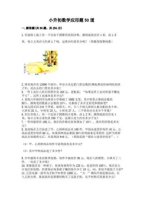 小升初数学应用题50道一.解答题(共50题,共294分)1.在建筑工地上有一个近似于圆锥形状的沙堆,测得底面直径4米,高1.5米。