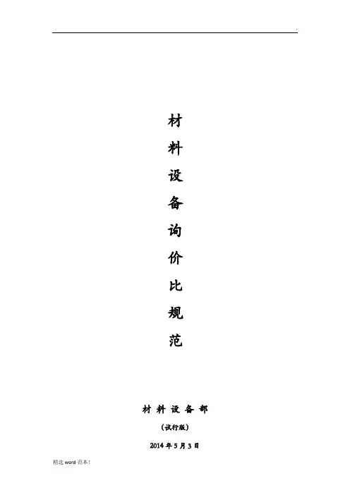 材料设备询价比规范材料设备部(试行版)2014年5月3日材料设备部询价规范1.目的为规范公司材料设备采购询价工作,使采购工作顺利进行,有效控制采购价格,提高采购管理管理水平,特制定本流程。