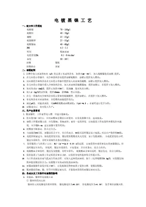 以下为一个常用的黑镍电镀液的配方:•氯化镍:150 g/L•氯化铵:50 g/L•硫酸镍:30 g/L•硫酸:50 g/L•温度:55-60°C•pH值:3.5-4.03.2 电镀条件黑镍电镀需要控制相应的电镀条件,以获得理想的电镀效果。