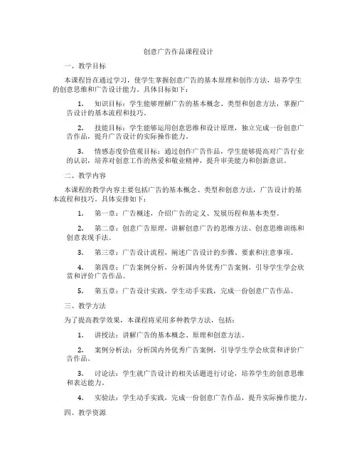 二、教学内容本课程的教学内容主要包括广告的基本概念、类型和创意方法,广告设计的基本流程和技巧。