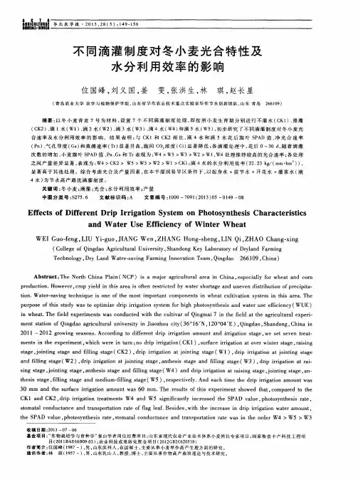 关键词:作物需水量; 有效降水量; 灌溉需水量; 水分利用效率Water use efficiency of several water-intensive crops in Hebei province inrecent 20 yearsSHI Meng-Xia, ZHANG Jia-Xiao, SHI Xiao-Yu, CHU Qing-Quan, CHEN Fu, and LEI Yong-Deng *College of Agronomy and Biotechnology, China Agricultural University / Key Laboratory of Farming System of Ministry of Agriculture and RuralAffairs, Beijing 100193, ChinaAbstract: In recent years, the large-scale planting of water-intensive crops is one of the important reasons for the increasingshortage of agricultural water resources in Hebei province. Based on the meteorological data and crop growth period data of 21national standard meteorological stations in Hebei province from 1999 to 2018, this study calculates the water demand, effectiveprecipitation, irrigation water demand and precipitation coupling degree of winter wheat, summer maize, apple, pear, watermelon,grape and other water-intensive crops in Hebei province by Penman-Monteith formula and piecewise single value average cropcoefficient method. The spatial and temporal variations of crop water use in Hebei province were comprehensively analyzed fromthe perspectives of water use efficiency (WUE), irrigation water use efficiency (WUEI), nutrient water use efficiency (WUEN),and economic water use efficiency (WUEE). The results revealed that the water requirement of fruit crops was higher than that ofgrain crops. The water requirement for crop irrigation from large to small was apple, pear, winter wheat, grape, watermelon, andsummer maize. During the growth period, the largest effective precipitation was apple and pear, and the lowest was winter wheat;the precipitation coupling degree of summer maize was the highest, followed by watermelon; the precipitation coupling degree ofall crops indicated an upward trend in the past 20 years except for winter wheat. The WUE, WUEI, and WUEE of fruit crops werehigher than those of grain crops, particularly, WUEE of fruit crops was 10 times higher than that of grain crops. In contrast, theWUEN of grain crops was higher than that of fruit crops. The comprehensive analysis of various crop water use efficiency pro-vides valuable insights for optimizing cropping systems and achieving agricultural water sustainability in Hebei province.本研究由国家自然科学基金项目(31801315, 72061147001), 国家重点研发计划项目(2016YFD0300201)和国家社科基金重大项目(18ZDA074)资助。