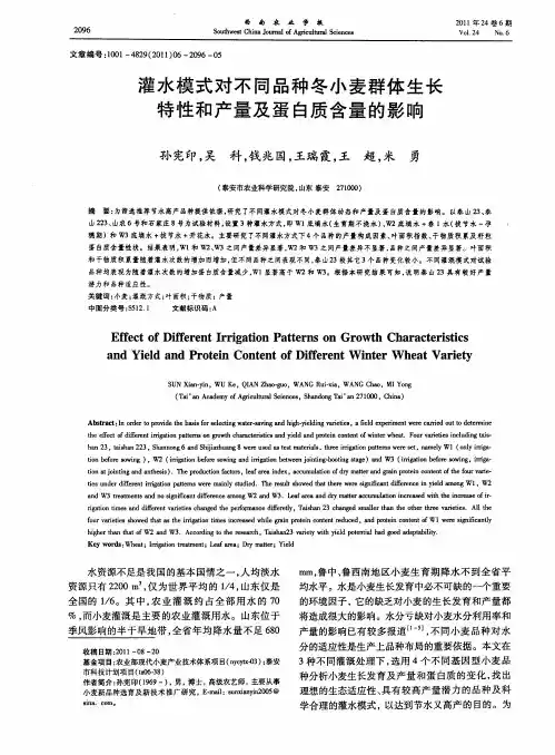 (一)不同播种行距与密度对小麦产量和水分利用效率的影响马爱平1,王娟玲2,靖华1,王裕智1,张红芳1,崔欢虎1(1.山西省农业科学院小麦研究所,山西临汾041000 ;2.山西省农业科学院旱地农业研究中心,山西太原030031)提要:在山西临汾采用小区试验设计研究了不同播种行密(行距与密度,下同)对小麦产量和水分利用效率的影响。