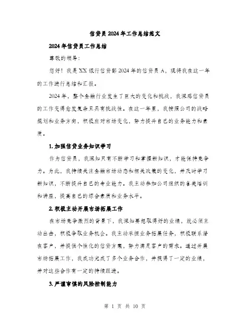 信贷员2024年工作总结范文2024年信贷员工作总结尊敬的领导:您好!我是XX银行信贷部2024年的信贷员A,现将我在这一年的工作进行总结和汇报。