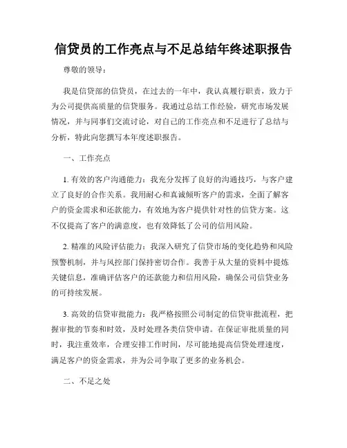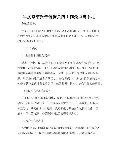 年度总结报告信贷员的工作亮点与不足尊敬的领导:我是XX银行信贷部门的信贷员,以下是我对自己一年来的工作进行的总结报告,希望能够向您汇报我的工作亮点和不足,以便能够更好地改进和提升自己。