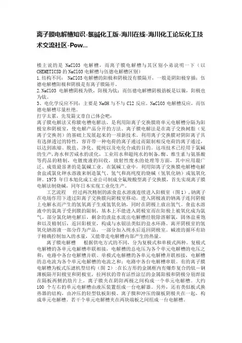 2、离子交换膜工作原理离子交换膜法制烧碱名称的由来,主要是因为使用的阳离子交换膜,该膜有特殊的选择透过性,只允许阳离子通过而阻止阴离子和气体通过,即只允许H+、Na+通过,而Cl-、OH-和两极产物H2和Cl2无法通过,因而起到了防止阳极产物Cl2和阴极产物H2相混合而可能导致爆炸的危险,还起到了避免Cl2和阴极另一产物NaOH反应而生成NaClO影响烧碱纯度的作用。