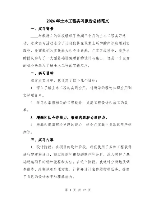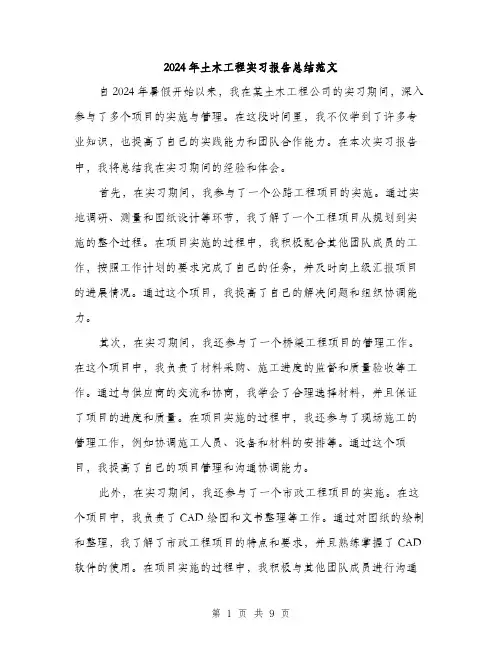 2024年土木工程实习报告总结范文自2024年暑假开始以来,我在某土木工程公司的实习期间,深入参与了多个项目的实施与管理。