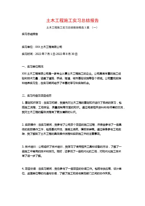 土木工程施工实习总结报告土木工程施工实习总结报告精选3篇(一)实习总结报告实习单位:XXX土木工程有限公司实习时间:2022年7月1日-2022年8月30日一、实习单位概况XXX土木工程有限公司是一家专业从事土木工程施工的企业。