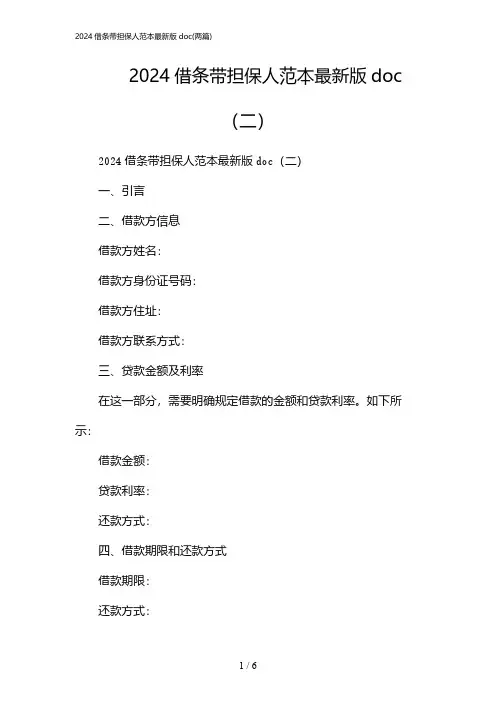结论2024借条带担保人范本最新版doc(一)2024借条带担保人范本最新版doc(一)一、引言二、借款人信息借条的第一部分应包括借款人的详细信息,包括姓名、住址、联系方式等。