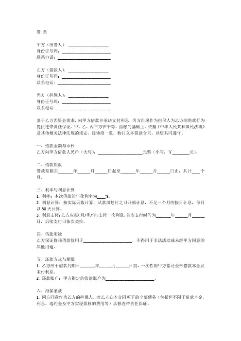 借条甲方(出借人):___________________身份证号码:_______________________联系电话:_________________________乙方(借款人):___________________身份证号码:_______________________联系电话:_________________________丙方(担保人):___________________身份证号码:_______________________联系电话:_________________________鉴于乙方因资金需求,向甲方借款并承诺支付利息,丙方自愿作为担保人为乙方的借款行为提供连带责任保证。