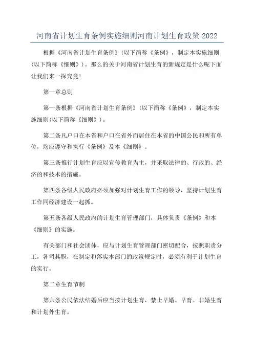 河南省计划生育条例实施细则河南计划生育政策2022根据《河南省计划生育条例》(以下简称《条例》,制定本实施细则(以下简称《细则》)。