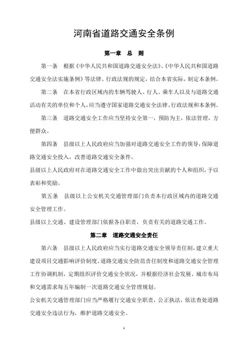 河南省道路交通安全条例第一章总则第一条根据《中华人民共和国道路交通安全法》、《中华人民共和国道路交通安全法实施条例》等法律、行政法规的规定,结合本省实际,制定本条例。