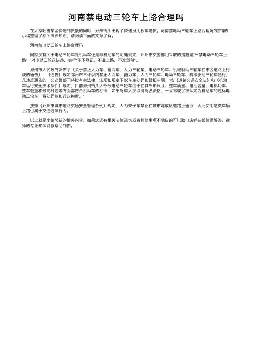 国家没有关于电动三轮车是机动车还是⾮机动车的明确规定,郑州市交警部门采取的措施是“严禁电动三轮车上路”,对电动三轮送快递,实⾏“不予登记,不准上路,不准驾驶”。