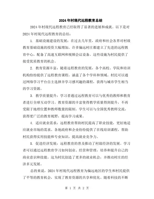 以下是我对2024年村远程教育工作的总结:一、发展概况2024年,村远程教育项目在全国范围内得到了广泛的推广。