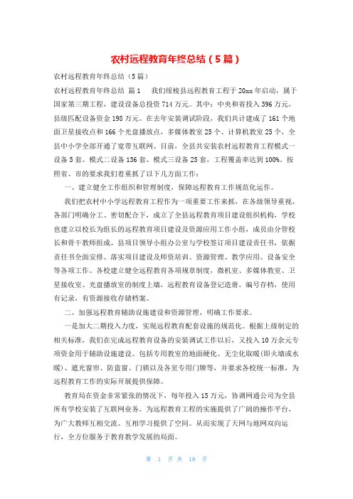农村远程教育工作总结及工作计划农村远程教育工作总结及工作计划一、工作目标和任务作为农村远程教育工作负责人,我的工作目标是促进农村地区教育事业的发展,让更多的农村学生接受更高质量的教育。