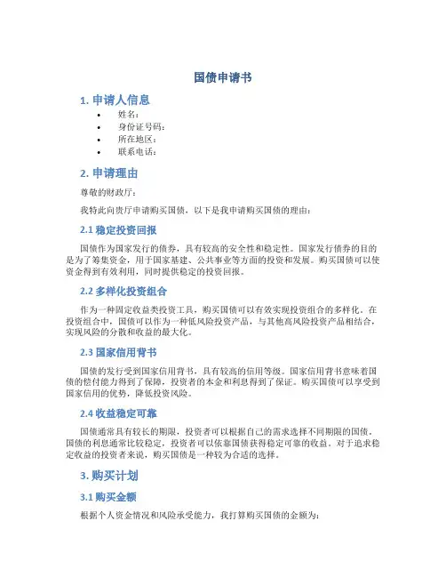 3. 购买计划3.1 购买金额根据个人资金情况和风险承受能力,我打算购买国债的金额为:•人民币(大写):•人民币(小写):3.2 购买期限我计划购买以下期限的国债:•期限1:•期限2:•期限3:3.3 购买途径我打算通过以下方式购买国债:•渠道1:•渠道2:•渠道3:4. 申请材料请在申请材料中包括以下文件:•身份证复印件•银行账户信息•其他支持材料5. 联系方式如有任何问题或需要进一步了解,请联系我:•姓名:•联系电话:•电子邮箱:6. 结语感谢贵厅对我申请的关注和支持,希望能够成功购买国债并实现稳定的投资回报。