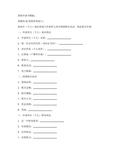 一、申请单位(个人)基本情况1. 申请单位(个人)名称:____________________2. 统一社会信用代码(身份证号码):____________________3. 单位性质(个人身份):____________________4. 注册地(户籍所在地):____________________5. 联系人:____________________6. 联系电话:____________________7. 电子邮箱:____________________二、国债购买意向1. 国债品种:____________________2. 购买金额:____________________3. 购买期限:____________________4. 购买方式:____________________5. 资金来源:____________________6. 用途:____________________三、申请单位(个人)财务状况1. 近一年财务报表:____________________2. 负债情况:____________________3. 信用状况:____________________4. 还款能力:____________________四、申请单位(个人)信用状况1. 信用评级:____________________2. 信用记录:____________________3. 是否存在逾期还款、拖欠债务等不良信用行为:____________________五、申请单位(个人)合规性声明1. 申请单位(个人)符合国家法律法规规定的国债购买条件。