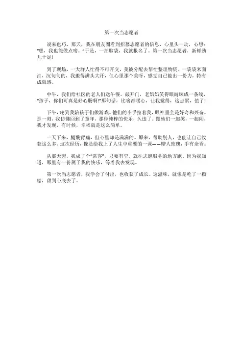 那么⼀般作⽂是怎么写的呢?下⾯是⼩编整理的第⼀次当志愿者作⽂,欢迎阅读,希望⼤家能够喜欢。