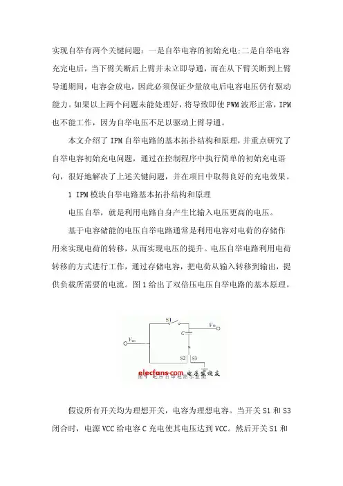 自举电路自举电路自举电路的基本拓扑结构和原理,并重点研究了自举电容初始充电问题,通过在控制程序中执行简单的初始充电语句,很好地解决了上述关键问题,并在项目中取得良好的充电效果。