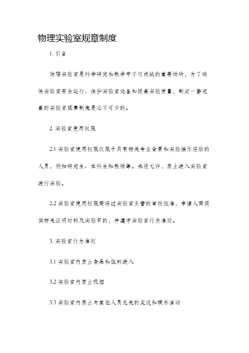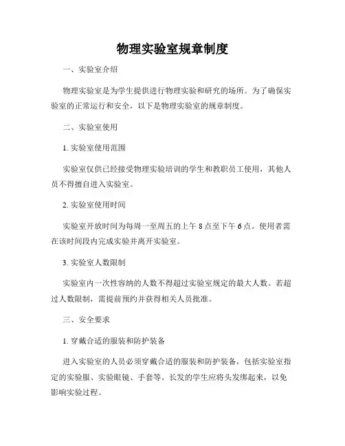 3. 实验室行为准则3.1 实验室内禁止食品和饮料进入3.2 实验室内禁止吸烟3.3 实验室内禁止与其他人员无关的交流和娱乐活动3.4 在实验室内应保持室内整洁、无尘、无杂物3.5 实验室内应穿着适当的实验服装和个人防护设备3.6 实验室内使用设备和仪器时应当遵守相关安全规定4. 实验室设备使用和保养4.1 实验人员应按照设备的使用手册和操作规程正确使用实验设备4.2 实验设备的保养应当经常进行,使用完毕后应清洁设备以确保下一次实验的顺利进行4.3 实验室设备损坏或出现问题时,应及时向实验室主管报告,并等待得到维修或替换的指示4.4 禁止私自搬动实验设备或改变设备布局5. 实验室安全5.1 实验室内应设置明显的安全注意事项和标识牌,并确保所有人员了解并遵守这些规定5.2 使用实验设备时应注意防范火灾、电击和化学品泄漏等安全隐患5.3 禁止使用有损健康或环境有害的化学品5.4 实验室内应始终保持通风良好,使用有毒物品时应注意防护措施5.5 实验室应设置紧急疏散通道,并定期进行紧急疏散演练5.6 实验人员应知悉实验室的应急处理措施,并能够正确应对应急情况6. 实验室数据管理6.1 实验人员应准确记录实验数据,并按照规定进行整理和存档6.2 实验数据的处理和分析应严格遵循科学方法和规范6.3 实验数据应按照相关规定保密,并仅限于在合适的情况下与其他人员共享7. 实验室规章制度的遵守和违反惩罚7.1 实验人员应严格遵守实验室规章制度,如发现违反行为应及时向实验室主管报告7.2 违反实验室规章制度的行为将受到纪律处分,包括口头警告、书面警告、限制实验室使用权限和其他相应的纪律处分8. 结论物理实验室规章制度的制定和执行是保证实验室安全和质量的重要措施,所有实验人员都应遵守这些规定,共同维护实验室的良好秩序和运行。