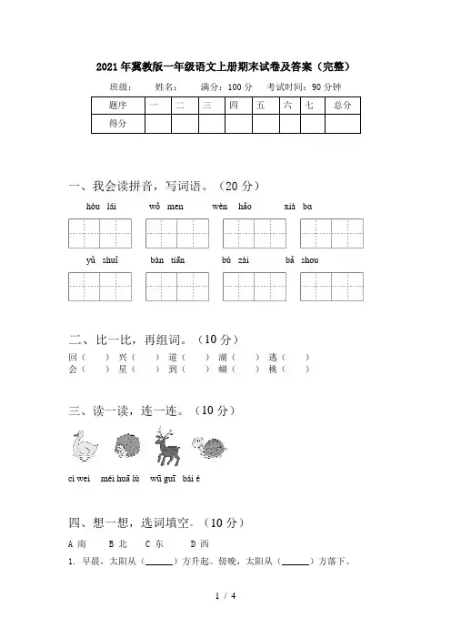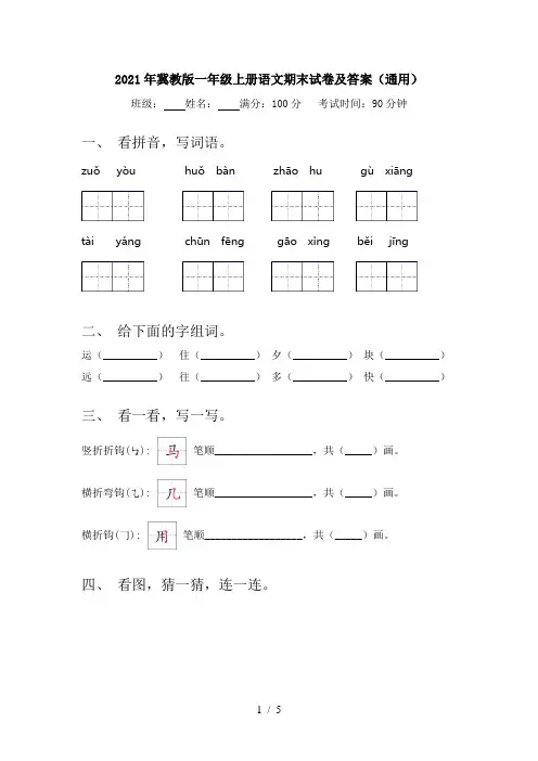2021年冀教版一年级语文上册期末试卷及答案(完整)班级:姓名:满分:100分考试时间:90分钟题序一二三四五六七总分得分一、我会读拼音,写词语。