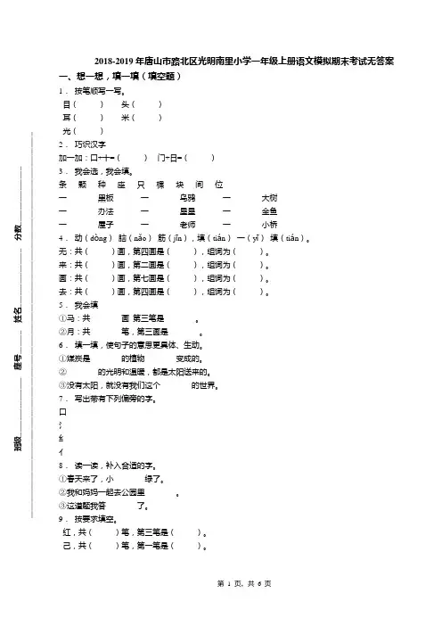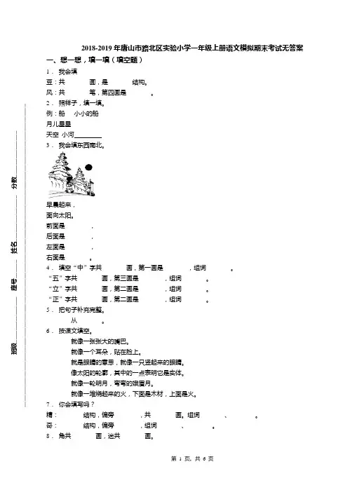 2018-2019年唐山市路北区实验小学一年级上册语文模拟期末考试无答案一、想一想,填一填(填空题)1. 我会填豆:共________画,是________结构。
