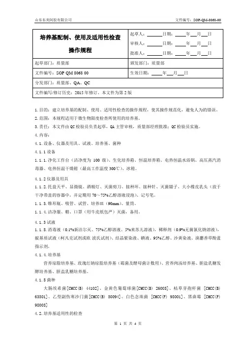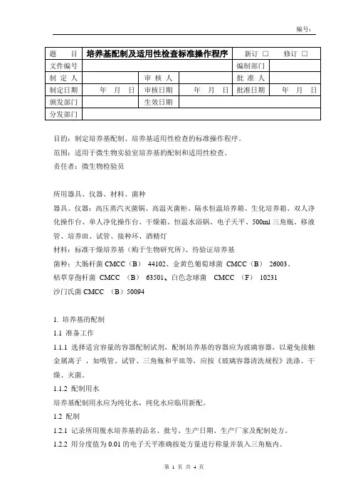 培养基适⽤性检查标准操作规程培养基适⽤性标准操作规程1⽬的规范培养基适应性检查的标准操作。