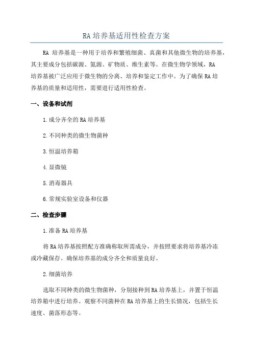 RA培养基适用性检查方案RA培养基是一种用于培养和繁殖细菌、真菌和其他微生物的培养基,其主要成分包括碳源、氮源、矿物质、维生素等。