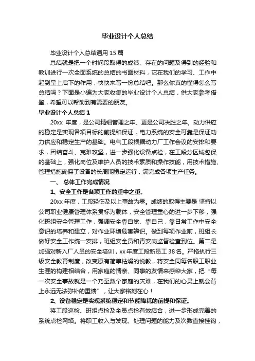 文档下载后可定制修改,请根据实际需要进行调整和使用,谢谢!并且,本店铺为大家提供各种类型的经典范文,如工作总结、学习总结、合同协议、规章制度、条据文书、事迹材料、心得体会、教学资料、作文大全、其他范文等等,想了解不同范文格式和写法,敬请关注!Download tips: This document is carefully compiled by this editor. I hope that after you download it, it can help you solve practical problems. The document can be customized and modified after downloading, please adjust and use it according to actual needs, thank you!Moreover, the shop provides you with various types of classic model essays, such as work summary, study summary, contract agreement, rules and regulations, documents, deeds materials, experience, teaching materials, composition, other model essays, etc.want to know different model essay formats and writing methods, please pay attention!毕设个人总结范文通用5篇当我们在写个人总结之前,一定要对自己的工作做好梳理,调整好自己的心态,个人总结写好了可以使我们的专业能力有所提升,以下是本店铺精心为您推荐的毕设个人总结范文通用5篇,供大家参考。