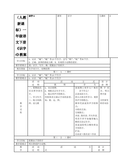第二篇:一年级语文下册识字4教案《识字4》教学设计山西省太原市三好小学王舒蓉教学内容本课选自义务教育课程标准实验教科书语文(人教版)一年级下册。