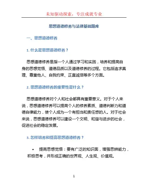 思想道德修养与法律基础题库一、思想道德修养1. 什么是思想道德修养?思想道德修养是指一个人通过学习和实践,培养和提高自身的思想觉悟、道德品质以及道德修养的过程。