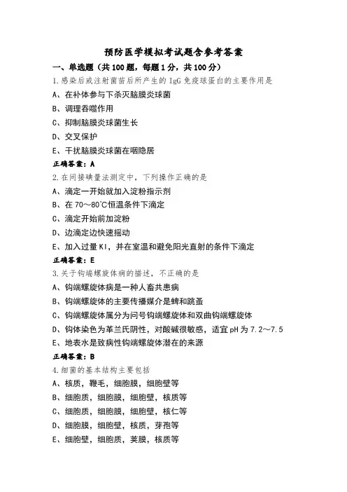 预防医学模考试题+参考答案一、单选题(共100题,每题1分,共100分)1.关于慢性病的预防与控制,以下哪些说法是正确的:A、主要采用三级预防措施B、主要采用疾病监测措施C、主要采用行为干预措施D、主要采用健康教育措施E、主要采用计划免疫措施正确答案:A2.医学统计学研究的对象是A、医学中的小概率事件B、各种类型的数据C、有变异的医学事件D、疾病的预防与治疗E、动物和人的本质正确答案:C3.影响和制约疾病流行的“两因素”指的是A、地理因素、社会因素B、自然因素、气候因素C、气候因素、地理因素D、自然因素、社会因素E、社会因素、气候因素正确答案:D4.四格表资料采用基本公式或专用公式计算不校正χ2值的条件是A、样本总例数大于40,且只有一个理论频数小于5B、样本总例数小于40,且最小理论频数大于5C、样本总例数大于40,且最小的理论频数大于5D、样本总例数大于40E、所有的理论频数均大于5正确答案:C5.卡介苗麻疹疫苗接种后血清阳转率的分母应为:A、获得肺结核终身免疫人数B、卡介苗接种人数C、卡介苗接种后的阳转人数D、肺结核患者人数E、肺结核易感人数正确答案:B6.两样本均数比较,检验结果P>0.05,说明A、两总体均数的差别较大B、不支持两总体有差别的结论C、两总体均数的差别较小D、支持两总体无差别的结论E、可以确认两总体无差别正确答案:B7.以下表述不正确的是()A、血红素铁比非血红素铁更容易吸收B、Fe3+比Fe2+更易吸收C、铁的吸收与个体生理状态有关D、锌降低铁的吸收E、维生素C有利于铁的吸收正确答案:B8.细菌性食物中毒的治疗原则除了( )A、治疗腹痛腹泻,纠正酸中毒B、特殊治疗C、细菌性食物中毒的患者均可用抗生素D、迅速排出毒物(催吐、洗胃)E、对症治疗正确答案:C9.以下关于参数估计的叙述,正确的是()。