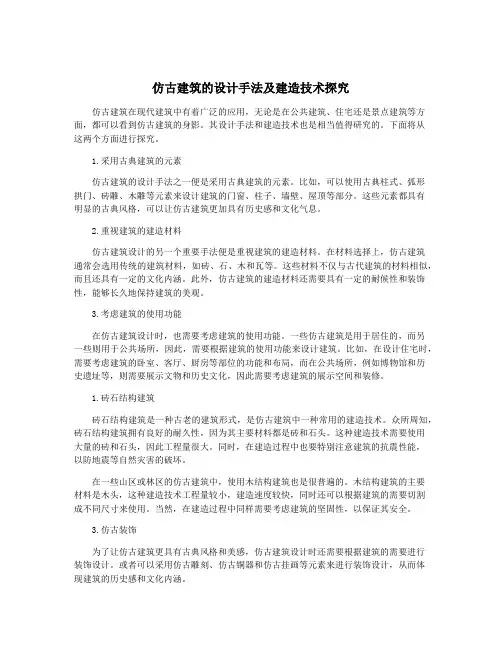 仿古建筑的设计手法及建造技术探究一、设计手法1. 民族特色的融合仿古建筑设计手法的关键之一是民族特色的融合。