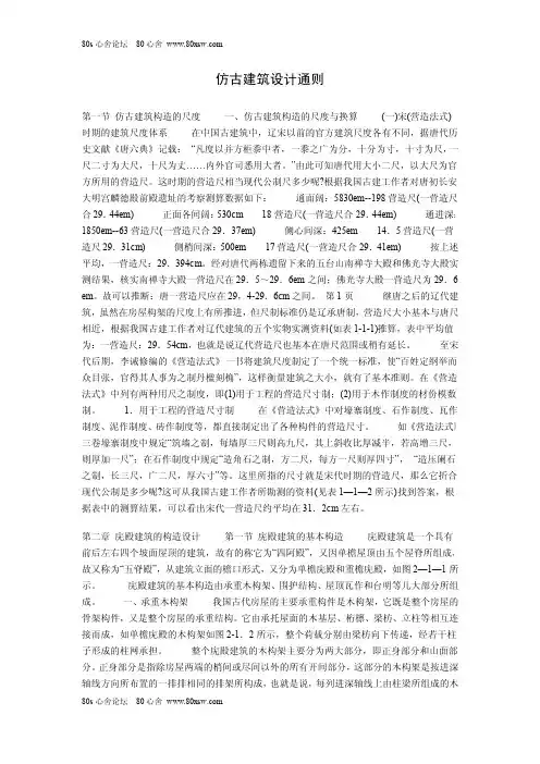仿古建筑设计通则第一节仿古建筑构造的尺度一、仿古建筑构造的尺度与换算(一)宋(营造法式)时期的建筑尺度体系在中国古建筑中,辽宋以前的官方建筑尺度各有不同,据唐代历史文献《唐六典》记载:“凡度以并方柜黍中者,一黍之广为分,十分为寸,十寸为尺,一尺二寸为大尺,十尺为丈……内外官司悉用大者。