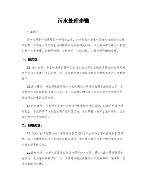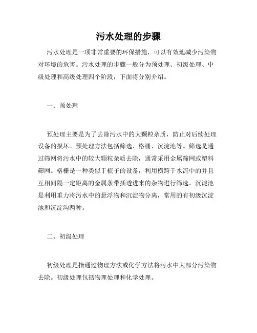 污水处理的步骤污水处理是指对废水进行净化和处理,使其达到排放标准或再利用的水质要求。
