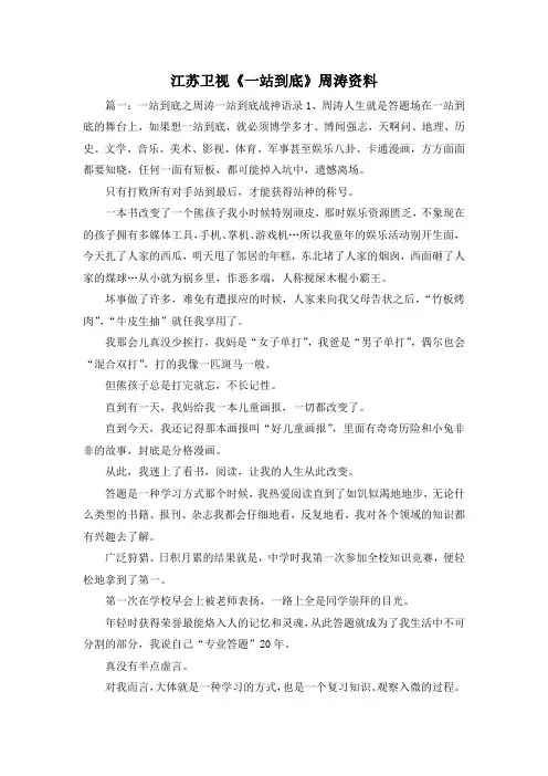江苏卫视《一站到底》周涛资料篇一:一站到底之周涛一站到底战神语录1、周涛人生就是答题场在一站到底的舞台上,如果想一站到底,就必须博学多才、博闻强志,天啊问、地理、历史、文学、音乐、美术、影视、体育、军事甚至娱乐八卦、卡通漫画,方方面面都要知晓,任何一面有短板,都可能掉入坑中,遗憾离场。