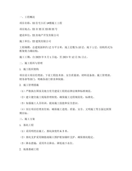 一、工程概况项目名称:XX住宅小区1#楼施工工程项目地点:XX市XX区XX路XX号建设单位:XX房地产开发有限公司施工单位:XX建筑有限公司工程规模:总建筑面积约12万平方米,地上层数为18层,地下1层,结构形式为框架剪力墙结构。