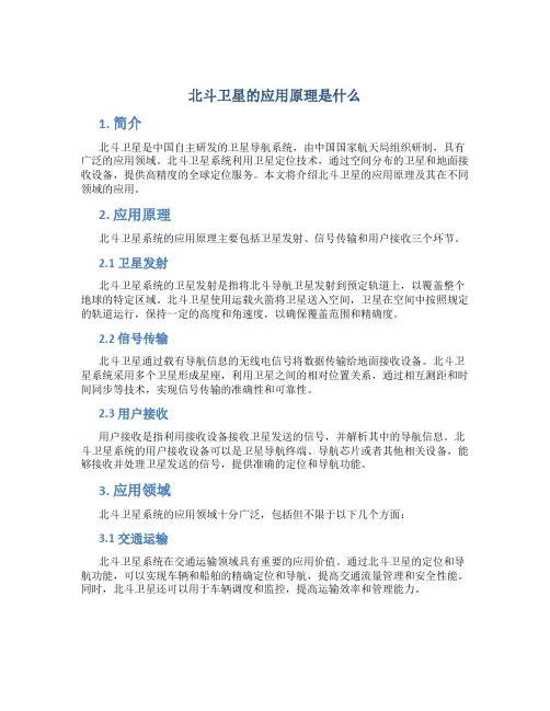 北斗卫星的应用原理是什么1. 简介北斗卫星是中国自主研发的卫星导航系统,由中国国家航天局组织研制,具有广泛的应用领域。