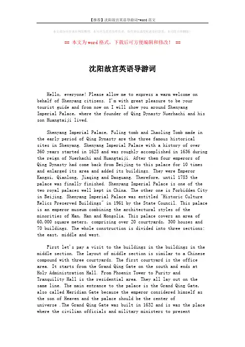 本文部分内容来自网络整理,本司不为其真实性负责,如有异议或侵权请及时联系,本司将立即删除!== 本文为word格式,下载后可方便编辑和修改! ==沈阳故宫英文导游词(共5篇篇一:沈阳故宫英语导游词沈阳故宫英语导游词Hello, everyone! Please allow me to express a warm welcome on behalfof Shenyang citizens. I’m with great pleasure to be your tourist guide and from now on I will show you around Shenyang Imperial Palace, where the founder of Qing Dynasty Nuerhachi and his son Huangtaiji lived.Shenyang Imperial Palace, Fuling tomb and Zhaoling Tomb made in the early period of Qing Dynasty are the three famous historical sites in Shenyang. Shenyang Imperial Palace with a history of over 360 years started in 1625 and was roughly accomplished in 1636 during the reign of Nuerhachi and Huangtaiji. After them four emperors of Qing Dynasty had come back from Beijing to this palace for 10 times and enlargedits area and added its buildings. They were Emperor Kangxi, Qianlong, Jiaqing and Daoguang. Therefore, until 1783 the palace was finally finished. Shenyang Imperial Palace is one of the two royal palaceswell kept in China. The other one is Forbidden City in Beijing. Shenyang Imperial Palace was entitled "Historic Culture Relics Preserved Buildings" in 1961 by the State Council. This palace is an emperor museum combining the architectural styles of the minoritiesof Man, Han and Mongolia. This palace covers an area of 60,000 square meters, comprising over 20 courtyards, 300 houses and 70 buildings. The whole construction is divided into three sections: the east, middle and west. First let’s pay a visit to the buildings in the buildings in the middle section. The layout of middle section is similar to a Chinese compound with three courtyards. The first courtyard is the office area. It starts from the Grand Qing Gate on the south and ends at Holy Administration Hall. From Phoenix Tower to Purity and Tranquility Hall is the residential area. They all lay out on the same line. The main entrance to the palace is the Grand Qing Gate, also called Meridian Gate because the emperor consideredhimself as the son of Heaven and the palace should be the center ofuniverse .The Grand Qing Gate was built in 1632 and is was the place where the civilian officials and military ministers to present themselves before the emperor daily .The special feature of the gateis the tile color. They are all yellow tiles but engraved with green borders. Yellow symbolizes the ground and the royal right while green represents sea and mountains. Thecombination of them means controlling the vast areas on the earth.The building to the east of Grand Qing Gate is called Ancestor Temple;Taimiao;with yellow tile roof, where Nuerhachi’s descendants offered sacrifices to their ancestors for blessings. So Ancestor Temple is the most important. Please follow me into the gate. This path in the middle links the gate to Holy Administration Hallwith Flying Dragon Pavilion;Feilongge; and Flying PhoenixPavilion;Xiangfengge; on each side. The Hall of Holy Administrationis the main building in the middle part of the palace and it was the center of the military, administrative affairs in early Qing Dynasty and had witnessed many national ceremonies. Flying Dragon and Flying Phoenix Pavilions were for storing music instruments. Holy Administration Hall was Emperor Huangtaiji’s office. In front of the hall are Rigui and Jiangliang, which were used as measure instruments and supposed to be the symbol of unity. In accident construction, office area is usually in the front part and residential area is in the rear.Since we have visited the place where the Emperors workedand now we’ll pay a visit to the place where empress and concubines lived. Here is the Phoenix Tower. It served as an entrance to therear chambers and also the entertainment area of Huangtaiji and his concubines, and some gatherings or banquets were held occasionally. The tower was built on a terrace 3.8 meters tall. It was the tallest building in Shenyang at that time .It is amazing watching suise inthe morning on the tower and Phoenix Suise is one of the famous Eight fascinating Scenes in Shenyang. Look upward, we will see a board hanging up on Phoenix Tower ,on which Emperor Qianlong inscribed "Ziqidonglai", which meant the Qing Dynasty in Beijing immigratedfrom Shengjing, the old name for Shenyang to the east .There are24staircases leading to Phoenix Tower representing 24 seasonal divisions points in Chinese lunar calendar.In Shenyang Imperialpalace chambers are higher than halls, which is contrary to the architectural style in Forbidden city in Beijing. Walking through the tower are the rear chambers. The one on the north in the middle was called Purity and Tranquility Hall, which was prepared for emperorand empress. The other four lying on both sides were forconcubines .Purity and Tranquility Hall has five rooms and the First from the east was where Huangraiji passed away here at theage of 52 without any disease. His throne passed to his ninth son, Fulin. In early Qing Dynasty, the construction style was summed up like this: bag-like house, zigzag bed and chimney sitting on the ground. The main buildings here were different from other buildings with a door was opened in the wall of the east room and the other rooms were connected together like a bag. The zigzag beds, made of mud and brick and with fire and smoke tunnels were called "kang" in Chinese. In order to get heat and keep room warm in winter, tunnels was made under the ground of Purity and Tranquility Hall to put fire and smoke through .Now notice the pole standing on the ground for smoke through.Now notice the pole standing right in the middle of the courtyard. This red pole is called Suolun pole, or Holy Pole. Its round tin container near the top was filled with food for feeding crows. It was said that Nuerhachi was saved by crows. Crows are considered s