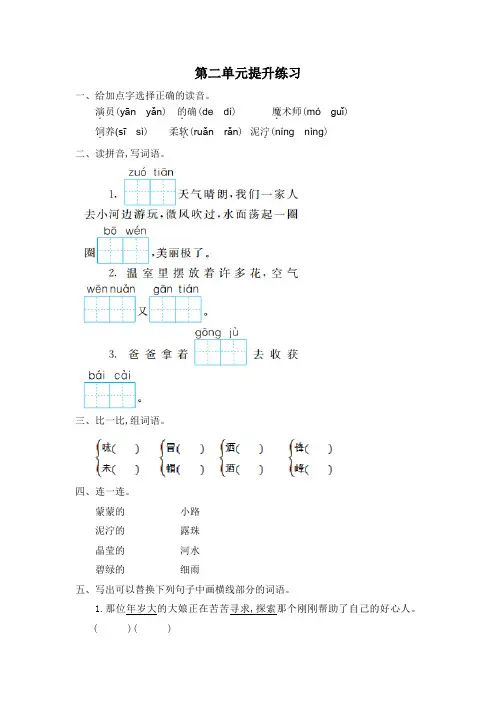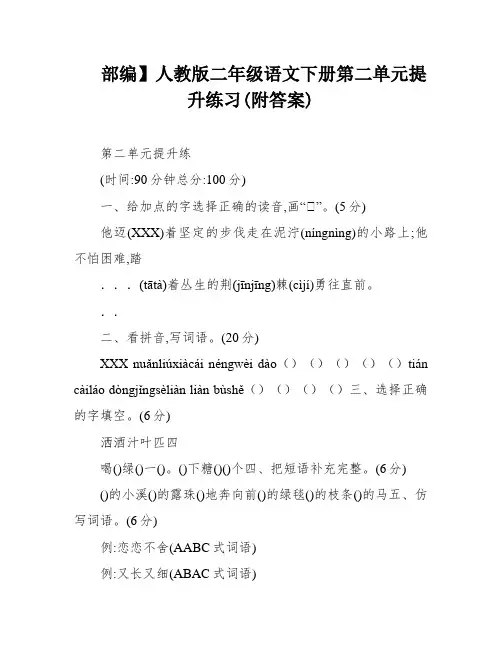 部编】人教版二年级语文下册第二单元提升练习(附答案)第二单元提升练(时间:90分钟总分:100分)一、给加点的字选择正确的读音,画“ ”。