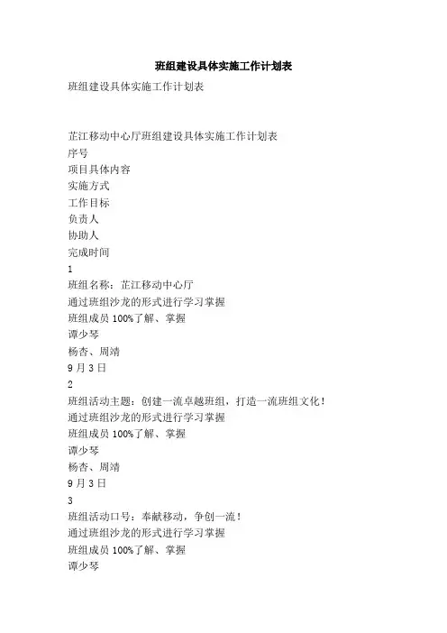 班组建设具体实施工作计划表班组建设具体实施工作计划表芷江移动中心厅班组建设具体实施工作计划表序号项目具体内容实施方式工作目标负责人协助人完成时间1班组名称:芷江移动中心厅通过班组沙龙的形式进行学习掌握班组成员100%了解、掌握谭少琴杨杏、周靖9月3日2班组活动主题:创建一流卓越班组,打造一流班组文化!通过班组沙龙的形式进行学习掌握班组成员100%了解、掌握谭少琴杨杏、周靖9月3日3班组活动口号:奉献移动,争创一流!通过班组沙龙的形式进行学习掌握班组成员100%了解、掌握谭少琴杨杏、周靖9月3日4班组服务理念:服务只有更好,没有最好!满意只有起点,没有终点!通过班组沙龙的形式进行学习掌握班组成员100%了解、掌握谭少琴杨杏、周靖9月3日5班组座佑铭:因为热爱,所以用心;因为专业,所以优秀;精诚团结,所向披麾!通过班组沙龙的形式进行学习掌握班组成员100%了解、掌握谭少琴杨杏、周靖9月3日6班组歌曲:《奔跑》通过班组沙龙的形式进行学习掌握班组成员100%了解、掌握谭少琴杨杏、周靖9月3日7班组团队日:每月17日通过班组沙龙的形式进行学习掌握班组成员100%了解、掌握谭少琴杨杏、周靖9月3日8班组标志:(略)通过班组沙龙的形式进行学习掌握班组成员100%了解、掌握谭少琴杨杏、周靖9月3日9《芷江移动中心厅班组管理制度集》通过班组沙龙的形式进行学习掌握班组成员100%了解、掌握,并将其运用到实际工作中谭少琴杨杏、周靖2010-9-3起10每月组织一次班组活动:比如共读一本书或共看一部电影每月不定期举行开展活动后每人上交一篇读后感或观后感谭少琴杨杏、周靖每月底前11制作特色版报将休息室的小黑板有效利用起来,作为展览小天地值班经理每日更新,将此作为大家的休闲家园谭少琴杨杏、周靖9月12号后每日更新12为班组博客献策献力每月每人至少在班组博客作一次更新(文字、图片或版务处理都可)让我们的班组博客更加美丽、生动谭少琴杨杏、周靖每月底前。