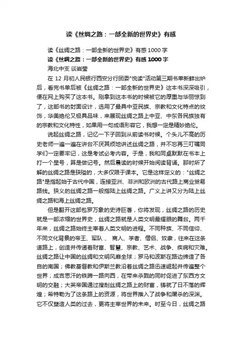 读《丝绸之路:一部全新的世界史》有感读《丝绸之路:一部全新的世界史》有感1000字读《丝绸之路:一部全新的世界史》有感1000字海北中支谈岩莹在12月初人民银行西安分行团委"悦读"活动第三期书单新鲜出炉后,看完书单后被《丝绸之路:一部全新的世界史》这本书深深吸引,便在网上购买了这本书。