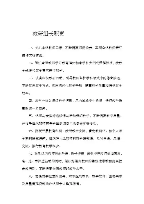 教研组长职责一、关心本组教师思想,不断提高师德修养,率领全组教师弄好精神文明建设。