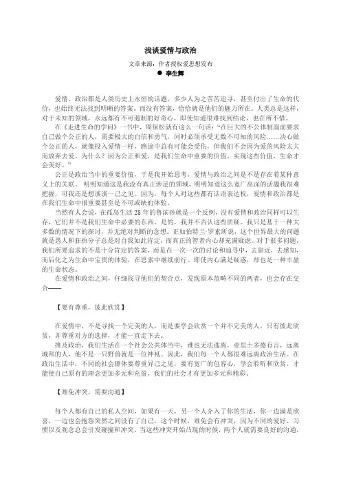 浅谈爱情与政治文章来源:作者授权爱思想发布●李生辉爱情、政治都是人类历史上永恒的话题,多少人为之苦苦追寻,甚至付出了生命的代价,也始终无法找到明晰的答案。