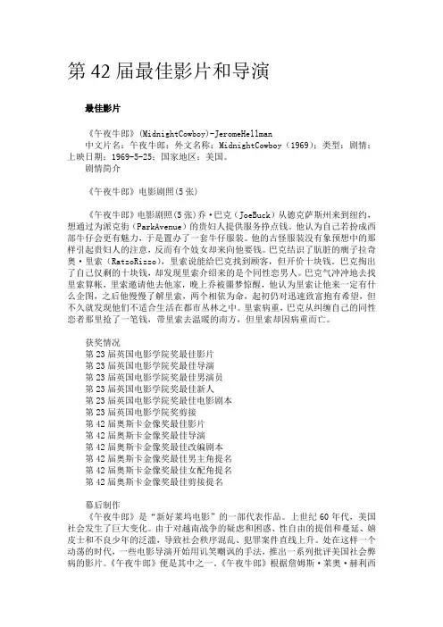第42届最佳影片和导演最佳影片《午夜牛郎》(MidnightCowboy)-JeromeHellman中文片名:午夜牛郎;外文名称:MidnightCowboy(1969);类型:剧情;上映日期:1969-5-25;国家地区:美国。