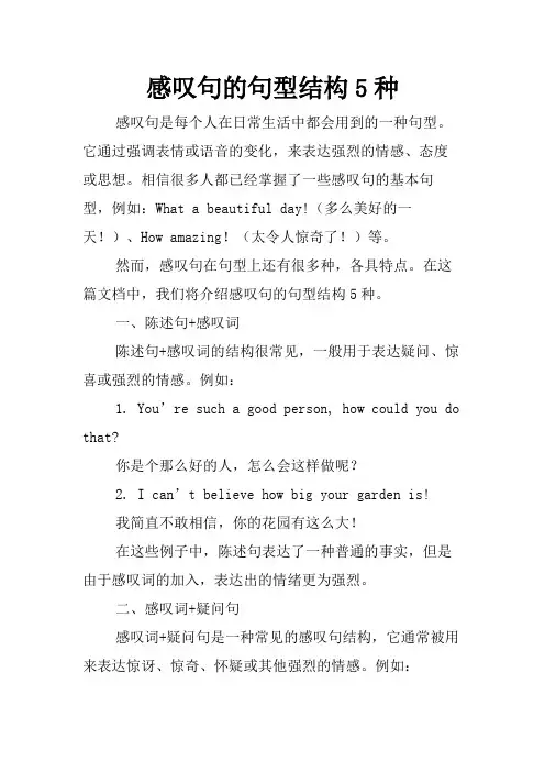 二、感叹词+疑问句感叹词+疑问句是一种常见的感叹句结构,它通常被用来表达惊讶、惊奇、怀疑或其他强烈的情感。