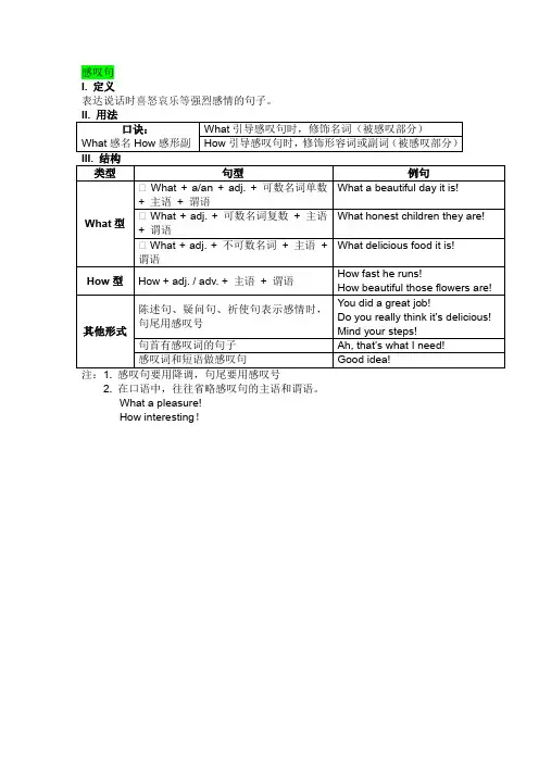 英语中感叹句的意义及用法1. 感叹句的定义感叹句是一种表示强烈感情的句式,能表达喜悦、愤怒、悲哀、惊奇、厌恶和赞赏的思想感情。