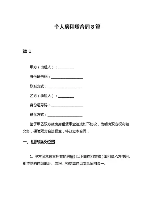 个人房租赁合同8篇篇1甲方(出租人):__________身份证号码:____________________联系方式:______________________乙方(承租人):__________身份证号码:____________________联系方式:______________________鉴于甲乙双方就房屋租赁事宜达成如下协议,为明确双方权利和义务,保障双方合法权益,特订立本合同:一、租赁物及位置1. 甲方同意将其拥有的房屋(以下简称租赁物)出租给乙方使用。