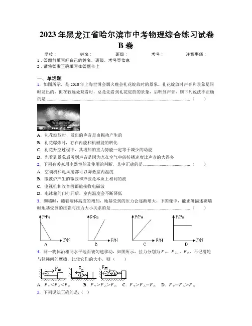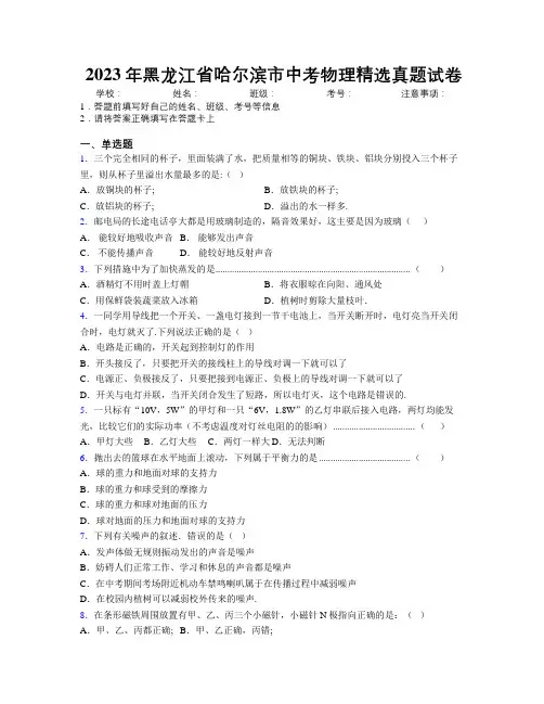 2023年黑龙江省哈尔滨市中考物理精选真题试卷学校:__________ 姓名:__________ 班级:__________ 考号:__________注意事项:1.答题前填写好自己的姓名、班级、考号等信息2.请将答案正确填写在答题卡上一、单选题1.三个完全相同的杯子,里面装满了水,把质量相等的铜块、铁块、铝块分别投入三个杯子里,则从杯子里溢出水量最多的是:()A.放铜块的杯子; B.放铁块的杯子;C.放铝块的杯子; D.溢出的水一样多.2.邮电局的长途电话亭大都是用玻璃制造的,隔音效果好,这主要是因为玻璃()A.能较好地吸收声音B.能够发出声音C.不能传播声音D.能较好地反射声音3.下列措施中为了加快蒸发的是................................................................................... ()A.酒精灯不用时盖上灯帽B.将衣服晾在向阳、通风处C.用保鲜袋装蔬菜放入冰箱D.植树时剪除大量枝叶.4.一同学用导线把一个开关、一盏电灯接到一节干电池上,当开关断开时,电灯亮当开关闭合时,电灯就灭了.下列说法正确的是()A.电路是正确的,开关起到控制灯的作用B.开头接反了,只要把开关的接线柱上的导线对调一下就可以了C.电源正、负极接反了,只要把接到电源正、负极上的导线对调一下就可以了D.开关与电灯并联,当开关闭合发生了短路,所以电灯灭,这个电路是错误的.5.一只标有“10V,5W”的甲灯和一只“6V,1.8W”的乙灯串联后接入电路,两灯均能发光,比较它们的实际功率(不考虑温度对灯丝电阻的的影响)................................... ()A.甲灯大些B.乙灯大些C.两灯一样大 D.无法判断6.抛出去的篮球在水平地面上滚动,下列属于平衡力的是....................................... ()A.球的重力和地面对球的支持力B.球的重力和球受到的摩擦力C.球的重力和球对地面的压力D.球对地面的压力和地面对球的支持力7.下列有关噪声的叙述.错误的是()A.发声体做无规则振动发出的声音是噪声B.妨碍人们正常工作、学习和休息的声音都是噪声C.在中考期间考场附近机动车禁鸣喇叭属于在传播过程中减弱噪声D.在校园内植树可以减弱校外传来的噪声.8.在条形磁铁周围放置有甲、乙、丙三个小磁针,小磁针N极指向正确的是:()A.甲、乙、丙都正确; B.甲、乙正确,丙错;C.甲、丙正确,乙错; D.乙、丙正确,甲错.9.水是人类生存不可缺少的物质,图中能正确描述水的各物理量之间关系的图象是()10.通常说“铁比木头重”,下面理解错误的是:()A.体积相同的铁块与木块相比,铁块质量大;B.铁的密度比木材密度大;C.质量相同的铁块与木块相比,铁块的体积小;D、铁块质量比木块大.11.小明乘公共汽车上学途中,突遇行人横穿马路,司机紧急刹车,这时小明看到司机叔叔旁边一平台上的杯子向前滑动,对杯子滑动过程中的运动描述正确的是 ......................... ()A.相对于地是静止的B.相对于地越来越快C.相对于地越来越慢D.相对于地作匀速直线运动12.以下事例中,属于有害摩擦的是............................................................................. ()A.走路时鞋底与路面间的摩擦 B.机械运转时轴承与滚珠间的摩擦C.拿东西时手与物品间的摩擦 D.写字时粉笔与黑板间的摩擦B13.王伟老师经常引导学生利用身边的生活用品做实验,通过动手动脑,学习物理知识,揭示物理规律.下面的实验(如图)不是揭示流体压强与流速关系的实验是 ................. ()14.有甲乙两台机器,甲做的功是乙做功的2倍,而乙做功所花的时间是甲的一半,由此可知()。