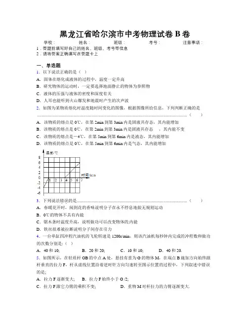 黑龙江省哈尔滨市中考物理试卷B卷学校:__________ 姓名:__________ 班级:__________ 考号:__________注意事项:1.答题前填写好自己的姓名、班级、考号等信息2.请将答案正确填写在答题卡上一、单选题1.以下说法正确的是()A.固体在熔化成液体的过程中,温度一定升高B.研究物体的运动时,一定要选择地面静止的物体为参照物C.液体的压强与液体的密度和深度有关D.人耳也能听到火山爆发和地震时产生的次声波2.如图为某物质熔化时温度随时间变化的图像,根据图像所给信息,下列判断正确的是 ............................................................................................................................................ ()A.该物质的熔点是0℃,在第2min到第3min内是固液共存态,其内能增加B.该物质的熔点是0℃,在第2min到第3min内是固液共存态,其内能不变C.该物质的熔点是-4℃,在第5min到第6min内是液态,其内能增加D.该物质的熔点是0℃,在第5min到第6min内是气态,其内能增加3.下列说法错误..的是....................................................................................................... ()A.春暖花开时,闻到花的香味说明分子在永不停息地做无规则运动B.0℃的物体不具有内能C.锯木条时温度升高,说明做功可以改变物体的内能D.铁丝很难被拉断说明分子间存在引力4.一台单缸四冲程汽油机的飞轮转速是1200r/min,则该汽油机每秒钟内完成的冲程数和做功的次数分别是:()A.40和10; B.20和20; C.10和10; D.40和20.5.如图所示,在轻质杆OB的中点A处,悬挂有重为G的物体M,在端点B施加方向始终跟杆垂直的拉力F,杆从虚线位置沿着逆时针方向匀速转至图示位置的过程中,下列叙述中错误的是;A.拉力F逐渐变大; B.拉力F始终小于G /2;C.拉力F跟它力臂的乘积不变; D.重物M对杆拉力的力臂逐渐变大.6.跳伞运动员在空中竖直降落,运动员和伞总重为800N,当空气对运动员和伞的阻力为1000N时,运动员和伞受到的合力大小是 ..................................................... ()A.1000N B.800NC.200N D.1800N7.下列做法不符合安全用电的是................................................................................... ()A.将电水壶的金属外壳接地B.在家庭电路中插座与电灯连接必须是并联C.家庭电路布线时熔断器应在总开关之后D.使用测电笔时手不能接触笔尾金属体8.关于电阻,下列说法中正确的是.................................................................................................... ()A.铜导线的电阻比铁导线的电阻小B.导体的电阻越大,电流通过导体产生的热量越多C.某学校教学楼中,同时发光的电灯越多,电路的总电阻越小D.导体两端的电压越大,导体的电阻越大9.通过甲、乙两导体横截面的电量分别是50C和100C,比较甲、乙两导体中的电流,正确的结果是()A.I甲=I乙 B.I甲<I乙C.I甲>I乙D.无法比较10.如图所示,下列说法错误的是 ()A.只闭合开关S1,只有L I发光B.只闭合开关S2,L2发光且电铃响C.闭合开关S1、S2,L1、L2并联D.只闭合开关S2,L2和电铃串联11.有一种望远镜也由两组凸透镜组成。
